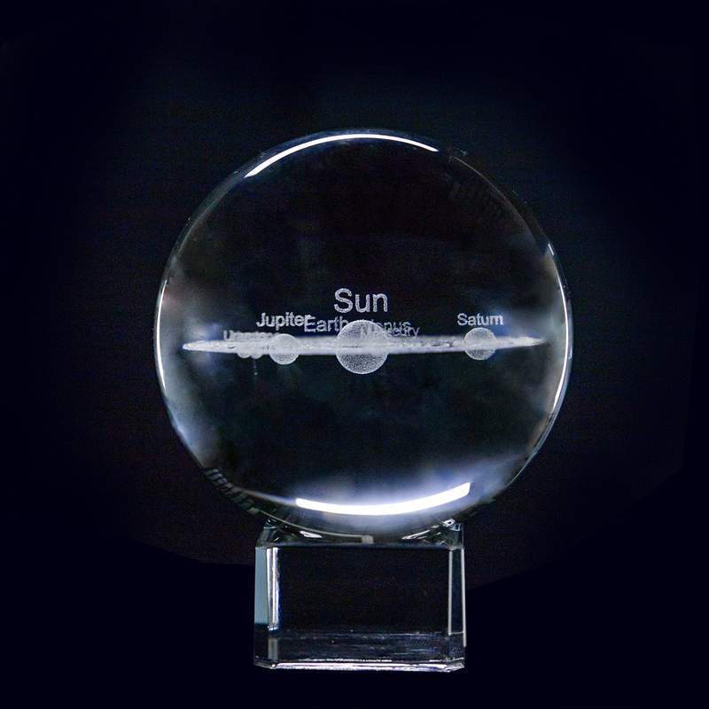 Hold the solar system in the palm of your hand. You can have a complete 360 Degree view of our universe. This 3D Solar System Crystal Ball provides a realistic view of all of our planets like it would be in real life. All planets are labeled with a beautiful white engraving, when light is laced below it, the Planets laser engravings will illuminate making it perfect for a night light.